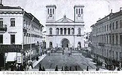 Bei dem Gotteshaus handelt es sich um einen eleganten, weißverputzten Bau, der zwar von der Straße Newski-Prospekt zurückgesetzt steht, aber dank seiner Größe und der beiden Türme sofort ins Auge fällt.
