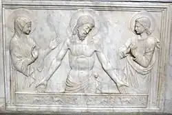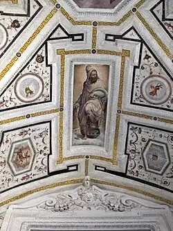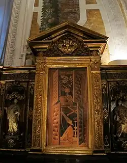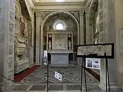Durch die erste Arkade links betritt man zunächst einen Vorraum mit einem Relief der Kreuzigung mit Maria, Johannes und Magdalena von Giulio Mazzoni und rechts einem Gemälde der Himmelfahrt Christi mit den Heiligen Sebastian und Nikolaus von Bari eines anonymen Künstlers um 1500.[4]
