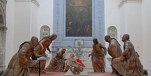 Den Höhepunkt des Oratoriums bildet die dritte und letzte Cappella del Compianto (Beweinungskapelle) mit der berühmten Skulpturengruppe Beweinung des toten Christus (Compianto sul Cristo morto) von Guido Mazzoni (1492), die von Eleonora von Aragon in Auftrag gegeben wurde.[1] Einige der acht Figuren sind Porträts der Herrscherfamilie der Aragonesen, Josef von Arimathäa trägt z. B. die Züge von Alfons II. von Aragon.[1][3] Der naturalistische Effekt der überaus ausdrucksvollen Figuren wurde ursprünglich noch durch eine farbige Fassung verstärkt, die leider verloren ist.[1] An der Rückwand dahinter hängt das Gemälde Kalvarienberg von Giuseppe Mastroleo, während die Seitenwände mit Reliefs geschmückt sind, das Begräbnis Jesu links wird Girolamo D’Auria zugeschrieben, die Auferstehung links ist mit 1567 datiert.