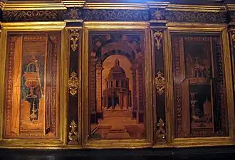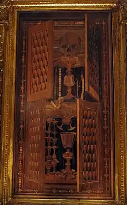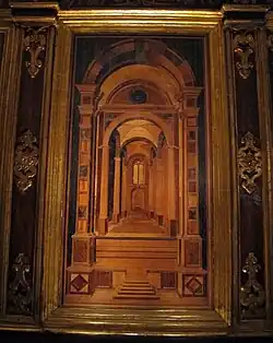 Die Wände ziert ein kunstvoll geschnitztes und mit Intarsien eingelegtes Mobiliar, das Fra Giovanni da Verona zwischen 1506 und 1510 ursprünglich für die Cappella Tolosa schuf (siehe unten Galerie);[4] es wurde erst 1688 hierher gebracht und mit einer barocken Ergänzungen versehen, als man das Refektorium in eine Sakristei verwandelte.