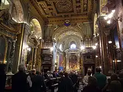 Die Kirche wurde als einschiffige Saalkirche ausgeführt. Die Längswände enthalten auf jeder Seite drei Kapellen. Wie in der Fassade, so werden die Kapellen von Pilastern toskanischer Ordnung getrennt, die die Bögen der Gewölbe der Seitenkapellen tragen. Die Schäfte werden jeweils mit rötlichen und gelblichen Marmorsorten gebildet. Die Unterzüge sind einheitlich mit jeweils fünf freskierten Feldern versehen. Die Kirche wird von einer vergoldeten und mit vergoldetem Stuck verzierten Kassettendecke gedeckt, eine Inschrift in der Mitte der Decke „VNIVERSITAS FABRORVM ANNO DOMINI 1604“[4] gibt Auskunft über den Entstehungszeitpunkt.
