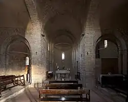 Das kurze tonnengewölbte Langhaus ist einschiffig und hat etwa dieselbe Breite (ca. 3,20 Meter) wie die Mittelapsis; die kleineren seitlichen Apsiden sind östlich an die beiden Querhausarme angefügt, die gegenüber dem Langhaus um eine Stufe erhöht sind. Die drei Apsiden bilden ein Triumphbogenschema. Das Kirchenschiff und die beiden Querhausarme sind durch schmale, hochgelegene und ursprünglich nicht verglaste Fensteröffnungen nur spärlich belichtet; sie sind tonnengewölbt (Scheitelhöhe ca. 7,50 Meter). Die Vierung ist hingegen von einer trompengestützten Kuppel überdeckt und die Apsiden zeigen die üblichen halbkuppelförmigen Kalottenwölbungen.