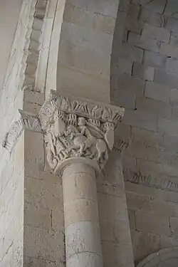 Auf dem Kämpfer der rechten Seite werden die drei Marien mit Salbgefäßen in den Händen am Grab Jesu dargestellt. Ein Engel weist auf das leere Grab. Seitlich stehen ein Mann und eine Frau, beide mit faltenreichen Umhängen bekleidet. Auf dem folgenden Kapitell sind zwei Personen mit ähnlicher Kleidung und einem Buch in der Hand dargestellt. Drei Kapitelle sind mit an den Spitzen eingerollten Blättern verziert, ein anderes mit einem Harpyienpaar. Ein weiteres Kapitell zeigt zwei bärtige Figuren, eine Figur, vielleicht der Apostel Petrus, hält zwei große Schlüssel in den Händen. An die Kapitelle schließt sich auf der rechten Seite des Portals ein Relief mit der Darstellung von neun Personen an, vermutlich ein nicht mehr vollständiger Zyklus der Monatsbilder.