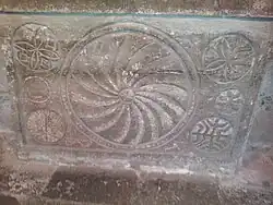 An der Stirnseite des Altars befindet sich eine fast einen Meter breite und 1,75 Meter lange Steinplatte, die in der Mitte mit einem großen Sonnenrad verziert ist. Auf beiden Seiten sind drei Kreise eingeritzt, in die Blütenmotive und wellenförmige Linien eingeschrieben sind. Bis 1971 lag diese Steinplatte mit der Vorderseite auf dem Boden und diente als Stufe zum Altar. Aufgrund der rätselhaften Symbole gibt es Vermutungen, dass diese Steinplatte bereits aus vorchristlicher Zeit stammen könnte.
