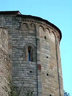 Besondere Aufmerksamkeit verdient die zweistöckige Apsis, die im Stil der lombardischen Romanik mit Lisenen, Blendbögen und einem Sägezahnfries verziert ist. Im oberen Stockwerk liegt der Altarraum, darunter die Krypta, die von einem Tonnengewölbe gedeckt wird. Auf beiden Stockwerken ist in der Mitte ein Rundbogenfenster eingeschnitten.