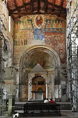 Auf dem Triumphbogen zur Apsis beeindruckt ein aufwändig gestaltetes Fresko aus dem frühen 14.Jh. mit seinem Jüngsten Gericht.