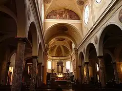 Die Innenseite der Kirche ist dreischiffig ausgeführt, die aus dem 15. Jahrhundert stammende Taufkapelle ist mit Sgraffito-Malereien verziert. Die 1740 vorgenommenen inneren Veränderungen des Gebäudes werden heute Francesco Croce zugeschrieben, das Mittelschiff wurde in barocker Raumgestaltung als Basilika mit runden Obergadenfenstern erhöht, die mit Stichkappen in das Tonnengewölbe ragen. An den Seiten der Kirche wurden im gleichen Zeitraum fünf neue Kapellen gebaut. Das 19. Jahrhundert brachte neue Renovierungen, insbesondere bei der Gewölbefresken und an den Balustraden und Marmorfußböden.