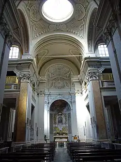 Die Raumlösung Valvassoris gilt als „interessant“[12]. Tatsächlich ist nicht zu erkennen, ob der Raum einem Zentralbauschema oder eher einer Kirche nach dem Konstruktionsprinzip des Längsraumes folgt, es handelt sich um einen Kompromiss zwischen beiden.[13] Die basilikale Struktur des mittelalterlichen Gebäudes griff Valvassori insoweit auf, als die Kirche drei Schiffe hat; der mittlere Teil des Mittelschiffes hingegen ist eher nach Zentralbauweise gestaltet. Die Grundform der Kirche ist ein griechisches Kreuz. Die Seitenschiffe öffnen sich in flache Kapellen, über der Vierung erhebt sich eine Kuppel. Die Laterne der Kuppel wurde 1891 zerstört, an ihre Strelle trat ein Opäum. Die Pilaster der Vierungspfeiler wie auch der übrigen Elemente sind nach Kompositordnung gestaltet, nur der Bogen der Apsis sitzt auf Kapitellen toskanischer Ordnung auf, die Kuppelzwickel und die Tonnengewölbe der Joche sind reich stuckiert.