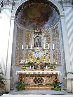 Die Tribuna ist durch eine Balustrade verschiedenfarbigen Marmors von den Kirchenschiffen abgetrennt. Im Hochaltar, hinter einem kleineren modernen, befinden sich die Reliquien des Pigmenius und der weiteren Märtyrer Pollio und Miles. Er stammt aus dem 18. Jahrhundert und wird Sebastiano Conca zugeschrieben.[14]