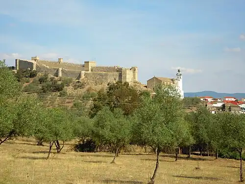 - Bedeutendstes Bauwerk ist die am Westrand des Ortes stehende und eine Geländefläche von ca. 132 × 45 m umschließende Burg (castillo). Sie wurde Ende des 13. Jahrhunderts erbaut und hatte wahrscheinlich keinen Vorgänger aus maurischer Zeit. Die aus nur wenig behauenen Bruchsteinen errichteten Außenmauern haben einen nur noch teilweise erhaltenen Zinnenkranz und werden durch 10 Türme gesichert und gleichzeitig stabilisiert.[8][9]