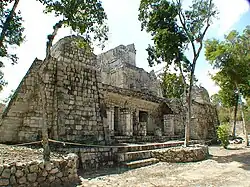 Von dem zu beiden Seiten anschließenden Gebäude sind nur kleine Reste erhalten. Über einem dreigliedrigen Sockel folgt eine, soweit erkennbar, glatte untere Wandfläche. Das mittlere Gesims ist dreigliedrig, in dem vertieften mittleren Band finden sich Gruppen von drei niedrigen Säulchen. Auf der oberen Wandfläche sind ebenfalls Gruppen von drei Säulchen zwischen glatten Wandflächen anzutreffen, die stärker an Formen im Puuc-Mosaikstil erinnern. Das obere Gesims entspricht dem mittleren plus der vorkragenden Steinreihe als oberem Abschluss.