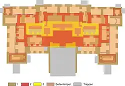 Auf dem dritten Niveau ist wegen des Zurückspringens der Stockwerke nur eine einfache Raumkette vorhanden, die aber durch geschickte Raumgliederung Platz für die Innentreppen auf der Rückseite des Gebäudes lassen musste. Die Räume öffnen alle nach der Ostseite: ein großer zentraler Raum, daneben auf beiden Seiten zwei kleine, vorspringende, hinter denen die Innentreppen liegen, und auf den Seiten zwei Räume mit dreifachem Eingang, die den darunter liegenden der Ostfassade entsprechen.