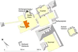 Südlich des Roten Hauses schließt ein einfacher gehaltenes Gebäude mit vier Räumen an. Abgesetzt von diesem liegt beinahe gegenüber der Monumentaltreppe des Palastes ein in seiner Art einmaliges Gebäude. Es besteht aus zwei Flügeln zu beiden Seiten eines Durchganges. In dem Durchgang führen Eingänge in zwei, zu dem Durchgang parallele Räume. Anschließend liegen nördlich und südlich des Durchganges zwei doppelte Räume, die sich nach Osten und Westen hin mit einem Portal mit zwei Mauerpfeilern öffnen. Bemerkenswert ist jedoch besonders der Fassadenschmuck des Durchganges, der an beiden Seiten ein großes, heute trotz Rekonstruktion nur in den untersten Teilen sichtbares Schlangenmaul-Portal zeigt. Ob und wie dieses Portal nach oben hin geschlossen war, ist aus dem gegenwärtigen Baubefund nicht zu erkennen.