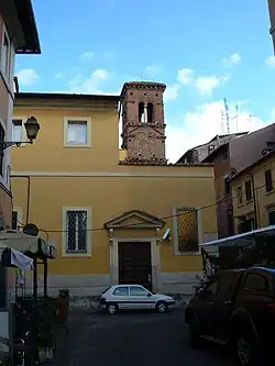 Bedeutsamer ist der Campanile aus dem 12. Jahrhundert. Er verdeckt die rechte Hälfte der Fassade und ist viergeschossig. Die für die Biforienfenster verwendeten Säulen, möglicherweise auch zumindest ein Teil der Konsolen zwischen den Geschossen bestehen aus in der Gegend gefundenen Spolien.[5]