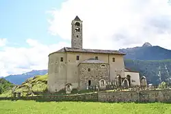 Die grüne Marmorimitation und die neueren Bilder wie die Abbildung der Heiligen Ambrosius und Agata auf beiden Seiten des Altars stammen von den Malern Calgari aus dem benachbarten Dorf Osco aus der Zeit um 1875. Auffallend ist die täuschend echt gemalte Holztür auf der linken Chorseite.