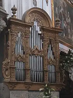 An beiden Seiten des Presbyteriums befinden sich zwei Orgelemporen (1674–1677), die auch von Dionisio Lazzari entworfen wurden und ursprünglich aus Marmor sein sollten, dann aber wegen finanzieller Engpässe aus Holz angefertigt wurden.[4][5] Die Orgel auf der linken Empore wurde vom Orgelbauer der königlichen Kapelle von Neapel Giuseppe De Martino zwischen 1685 und 1689 gebaut; sie ist das älteste erhaltene Instrument dieses bedeutenden Orgelbauers, auf dem auch Alessandro Scarlatti (1660–1725) gespielt haben soll.[4][5] Die Disposition bestand im Original aus 7 Registern (Principale 8′, Ottava, XV, XIX, XXII, XXVI, XXIX), 1859 wurde ein Contrabbassi eingebaut.[5] Die Tastatur hat 48 Tasten und ist durchgehend chromatisch – zur Entstehungszeit noch eine Seltenheit –, aber ohne das tiefe c#.[5]