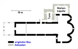 Gerüstlöcher an der Südwand zeigen eine erhebliche Erweiterung des Längsschiffes in einer zweiten Bauphase an. Fassade, Portikus und Turm sowie die im 13. Jahrhundert angebaute Marienkapelle sind Ergänzungen des ursprünglichen Baukörpers. Der Glockenturm ist etwa 41 Meter hoch und 8 × 8 Meter breit.