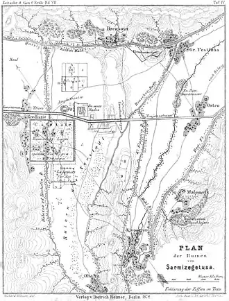 - Die Ruinen einer Festung, der ehemaligen römischen Hauptstadt Dakiens Colonia Ulpia Traiana,[7] errichtet unter Kaiser Trajan zwischen 108 und 110 n. Chr., welcher Kaiser Hadrian die Bezeichnung Sarmizegetusa hinzufügte – abgeleitet vom einstigen Zentrum des Dakerreiches, Sarmizegetusa Regia, das die Römer zuvor zerstört hatten[3] – steht unter Denkmalschutz.[8] Das Anwesen in rechteckiger Form umfasste eine Fläche von etwa 32 Hektar. Die 1,80 Meter dicken und 4–5 Meter hohen Mauern dehnten sich auf einer Länge von 450 Meter in Nord-Süd-Richtung und 600 Meter in Ost-West-Richtung aus. An allen Ecken der Anlage waren Wehrtürme, an jeder Seite ein Eingangstor und rundum ein etwa 4–5 Meter breiter Wassergraben. Das bedeutendste Gebäude der Anlage war der Augustus-Palast (aedes augastalium, 85 × 65 m), errichtet aus Stein, Ziegeln und Marmor. Südlich des Palastes befand sich der öffentliche Marktplatz aus zwei Teilen; ein schmaler (85 × 10 m) geschmückt mit Statuen und Skulpturen und ein größerer Teil (42 m breit, da noch nicht endgültig erforscht, Länge unbekannt). Dieser war mit Steinplatten gepflastert und hatte einen Kanal für das Regenwasser.[5] Nach 271 n. Chr. verfiel die Stadt; wahrscheinlich im 13. Jahrhundert war sie eine Ruine. Das Baumaterial der Kirchen von Densuș und Strei stammte von hier.[3]