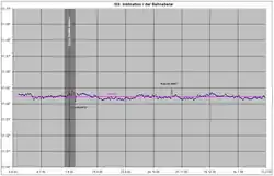 Obwohl die Werte der numerischen Exzentrizität sehr klein sind – Abweichung von der idealen Kreisbahn zwischen 0,0685 ‰ und 1,1033 ‰ – ist bei entsprechender Skalierung ein deutlicher Sprung zum Zeitpunkt des letzten Orbit-Reboost zu sehen (Diagramm 4). Das liegt daran, dass die Beschleunigung beim Anheben der Umlaufbahn hauptsächlich in Richtung des Apogäums gewirkt hat und die Bahnellipse dadurch etwas gestreckt wurde, was wiederum eine Zunahme der Exzentrizität mit sich bringt (siehe auch nächster Abschnitt Bahnhöhen-Diagramm). Sind solche Bahn-Korrekturmanöver geplant, gibt das die NASA in ihren Bulletins bekannt,[6] denen man die Richtungs- und Geschwindigkeitsänderung in Vektordarstellung entnehmen kann (Achtung: Die Angaben dort erfolgen in feet per seconds und nautical miles).