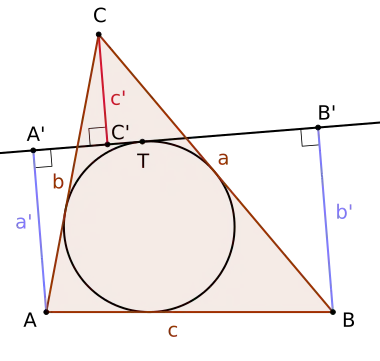 Bei einem beliebigen Dreieck ABC mit den Seitenlängen a, b und c seien a' , b' und c' die vorzeichenbehafteten Abstände der Eckpunkte A, B und C von einer Tangente des Inkreises. Dann gilt, dass die Summe der Produkte von vorzeichenbehaftetem Abstand und Seitenlänge dem doppelten Flächeninhalt des Dreiecks entspricht: