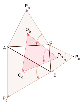 Seien die Ortsvektoren der Eckpunkte eines beliebigen Dreiecks und die Ortsvektoren der Spitzen der gleichseitigen Dreiecke. Weiterhin eine Drehmatrix, die um nach links dreht. Dann gelten die folgenden Gleichungen:[1]