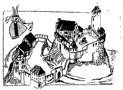 Im Norden steht der restaurierte Bergfried, der etwa 19 Meter hoch ist und einen Durchmesser von fast 8 Metern aufweist und bis zu 2,70 Meter dicke Mauern hat. Er ist als Rundturm ausgeführt und wird in das 13. Jahrhundert datiert. Der mittelalterliche Eingang befand sich in 9 Metern Höhe, wo der Turm noch eine Mauerstärke von 2,10 Metern hat.[32] Der heutige Eingang zum Bergfried wurde erst 1856 in den Mauersockel gebrochen. Der Turm hat heute als Abschluss eine begehbare Plattform und kann als Aussichtsturm bestiegen werden. Eine Zeichnung von 1844[33] zeigt nur noch den hohen Mauerstumpf ohne den oberen Abschluss. Von einer allfälligen Bebauung des Geländes innerhalb des Berings haben sich nur im südlichen Teil Reste eines mindestens zweigeschossigen Gebäudes erhalten, das der Palas gewesen sein könnte. Hierin ist auch der Rest eines Tonnengewölbes sichtbar.
