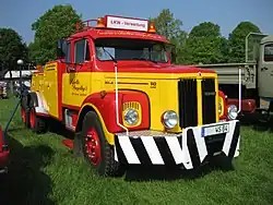 1968 fiel der traditionsreiche Doppelname „Scania-Vabis“ weg, der bisher auch als Schriftzug an den Fahrzeugen zu sehen gewesen war. Fortan stand auf den Kühlerblenden nur noch Scania. Weiterhin wurden auch Omnibusse hergestellt.[21] Für die schweren Frontlenker-Lkw erschien 1968 ein neues Fahrerhaus, das nun kastenförmig gestaltet war.[22] Auffälligstes Erkennungsmerkmal der Scania-Frontlenker waren und sind durch alle Nachfolgegenerationen bis heute die breiten Querbalken auf der Fahrzeugfront, die zunächst als Design nicht unumstritten waren. Das Kabinendesign war dennoch so fortschrittlich, dass es sich mit kleinen Retuschen auch während der gesamten Bauzeit des Nachfolgers, der Serie mit den Endziffern 1, bis 1980 hielt.