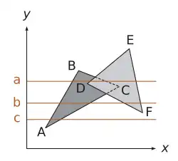 Die Bildzeilen werden von links nach rechts abgearbeitet. Bei der Bildzeile c verfährt der Algorithmus folgendermaßen: Sobald die Kante AB erreicht wird, wird das In-out-Flag des entsprechenden Polygons gesetzt; der Algorithmus ist jetzt „in“ diesem Polygon, und Pixel werden entsprechend der mit dem Polygon verknüpften Shading-Informationen eingefärbt. Sobald die Kante AC erreicht ist, wird das Flag wieder auf falsch gesetzt. Da die Kante AC die letzte in der aktiven Kantentabelle ist, ist der Vorgang für diese Bildzeile beendet. Bei der Bildzeile b sind zwei Polygone beteiligt, da sie aber hier einander nicht überlappen, betrachtet der Algorithmus genau wie im vorherigen Fall stets nur maximal ein Polygon pro Pixel.