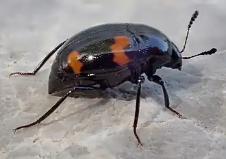 Die Käfer erreichen eine Körperlänge von 4,5 bis 6 Millimetern. Ihr schwarz glänzender Körper ist breit, kurz und hat eine ovale Form. Der Halsschild läuft nach vorn konisch zu, die Seiten sind nicht eingeschnürt. Er hat vor der Basis eine grob punktförmig strukturierte, quere Bogenlinie und ist davor sehr fein punktiert. Die Deckflügel tragen je zwei rote Querflecken und sind ansonsten fein verworren punktförmig skulpturiert. Basal liegt eine nach außen verkürzte Querlinie, die grob punktiert ist. Der Kopf ist fast glatt. Die Flügeldeckennaht ist tief eingedrückt. Die Schienen (Tibien) sind sehr schwach gebogen.