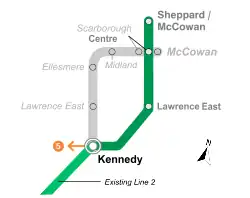 Die Scarborough-Linie wurde, nachdem die Stilllegung ursprünglich für den 18. November 2023 vorgesehen war, am 24. August 2023 endgültig stillgelegt. Der Betrieb nach einer Entgleisung in der Nähe der Station Ellesmere bereits am 24. Juli 2023 eingestellt worden.[18] Die Bahnstrecke zwischen den Stationen Kennedy und Ellesmere wird asphaltiert und in ein Bus Rapid Transit umgewandelt, das voraussichtlich 2025 eröffnet wird. Fahrgäste müssen Busse zwischen den Stationen Kennedy und Scarborough Center benutzen, bis die Erweiterung der Bloor-Danforth-Linie im Jahr 2030 eröffnet wird.[19]