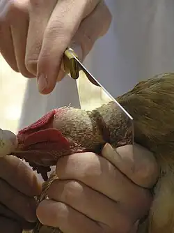 - das Drücken des aufliegenden Messers in den Hals (hebr. Derassa)