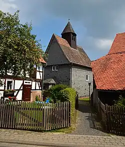 - ↑ Damit sind ältere Vermutungen, die Kirche stamme aus dem Beginn des 17. Jhs., überholt (vgl. etwa: I. Bott: Fachwerkkirchen in Hessen, Königstein im Taunus 1987, S. 13–14; Georg Dehio, bearbeitet von Folkhard Cremer, Tobias Michael Wolf und anderen: Handbuch der deutschen Kunstdenkmäler, Hessen 1, Regierungsbezirke Gießen und Kassel. Deutscher Kunstverlag, 2008, ISBN 978-3-422-03092-3, S. 820).