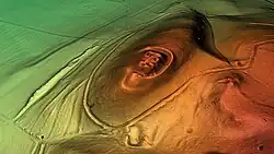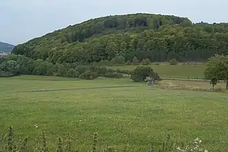 ![]() Ansicht des Berges Schorn von Norden, die Burgstelle liegt links der Bresche im Wald. Unterhalb verläuft die Landesstraße L 1026 (Dermbach-Geisa). | ||