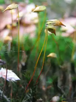 Die Kapsel sitzt auf einem 4–8 cm langen Stiel (Seta), der meist unten rötlich und oben gelblich ist. Sie wird zunächst von einer gelbbraunen, behaarten Kapuze, der Kalyptra bedeckt. Bei Reife ist die Kapsel stark vier- bis sechskantig und nickt.