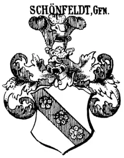 Sie stehen in keinem genealogischen Zusammenhang mit dem sächsischen Adelsgeschlecht Schönfeld.[1] und dem gleichnamigen böhmischen Geschlecht mit einem anderen Wappen (Pfahl und Balken mit drei Sternen), die 1594 geadelt wurde. Von ihr stammte Johann Ferdinand von Schönfeld (seit 1814 Ritter von Schönfeld).