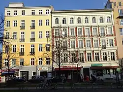 Die Gebäude der Schönhauser Allee 20/21 im Prenzlauer Berg in Berlin, direkt am U-Bahnhof Senefelderplatz, waren die ersten öffentlich besetzten Häuser in der ehemaligen DDR bzw. Ostberlin.