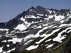 | Schöntalspitze (in Bildmitte) von Süden, links davon die Zischgenscharte | ||