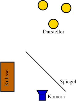 Abbildung 2 veranschaulicht, welches Bild die Kamera aufnimmt: Dort, wo der Spiegel intakt ist, erscheint das Spiegelbild der Kulisse. Dort, wo die Spiegelschicht fehlt, kann die Kamera die Darsteller (durch die Glasscheibe hindurch) mit aufnehmen.