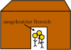 Nachdem die Kulisse richtig positioniert wurde, werden mit einem Messer die Teile der Spiegelschicht entfernt, an denen später die Darsteller zu sehen sein sollen. Dadurch wird dieser Teil des Spiegels durchsichtig.