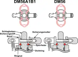 Im Unterschied zum Zünder DM56 besitzt der Zünder DM56A1B1 eine weitere Sicherung gegen das Versagen der Sperrfeder. Dabei wurde im Zünderoberteil eine zusätzliche Ringnut ergänzt und die Breite des Bundes von Sicherungsstift und Sicherungsmutter vermindert. Im Falle einer defekten Sperrfeder wird beim Herausziehen des Sicherungsstiftes dessen Bund durch die Federkraft des vorgespannten Schlagbolzens bis auf die Zünderoberseite gedrückt. Wird der Sicherungsstift weiter abgezogen, rastet sein Bund in die Ringnut der Zünderstirnfläche ein und wird somit festgelegt. Ein weiteres Herausziehen des Sicherungsstiftes ist nicht möglich und der Schlagbolzen bleibt gesichert.