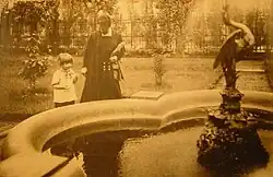 Der ehemalige Garten (heute Schützenstraße 1a) war symmetrisch angelegt, mit einem Wegkreuz in der Mitte, bei dem sich ein Springbrunnen befand. Einige große Bäume aus der Zeit vor dem Bau waren darin eingebunden. Der Springbrunnen hatte in etwa das Ausmaß des heutigen Brunnens am Bamberger Schönleinsplatz. Ein Reiher aus Bronze diente als Wasserspeier. Ein gleichartiger Reiher stand in Schloss Linderhof vor dem Königshaus von Maximilian II., bevor Ludwig II. sein neues Schloss mit einer einheitlichen Fassade versah. Dieser Reiher stammte vermutlich aus der Werkstatt Ludwig Schwanthalers und wurde in der Werkstatt Ludwig Schallers in Bodenwöhr gegossen.