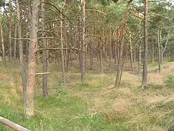 Hinter dem breiten weißen Strand schützt eine zehn Kilometer lange und bis zu sieben Meter hohe Küstenschutzdüne das Hinterland vor Sturmhochwassern. Durch eine aufwändige Bepflanzung mit Strandhafer (Ammophila arenaria) wird eine Stabilisierung der Düne erreicht, die der Abtragung durch Wind und Meeresbrandung entgegenwirkt und das Höhenwachstum fördert. Hinter der Hauptdüne folgt eine kleinbuckelige Dünenlandschaft (ein bis fünf Meter über NN), die in den Jahren 1866, 1881, 1901, 1952 und zuletzt 1957 mit Kiefern (Schwarzkiefern), Birken, Traubeneichen und Stieleichen bepflanzt wurde.[2] Dieser Küstenschutzwald hat eine Fläche von 168 ha und reicht bis zum südwestlich gelegenen Boddenufer. Vor dieser Aufforstung wurde die Schaabe jahrhundertelang auch „Schmale Wittower Heide“ genannt.