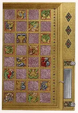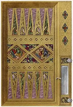 Das Spielbrett ist zweiseitig angelegt und kann wie ein Diptychon zusammengeklappt werden. Im geöffneten Zustand hat es die Maße 34,8 × 46,4 × 3,7 Zentimeter.[3]