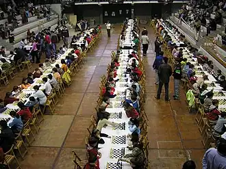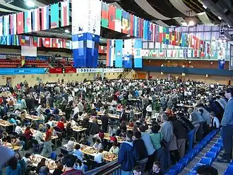 Im Jahr 1924 wurde ein Versuch gestartet, Schach in die Olympischen Spiele einzugliedern. Dieser Versuch scheiterte jedoch, weil es sehr schwer war professionelle Schachspieler von Amateurspielern zu unterscheiden.[10] Die erste inoffizielle Schacholympiade wurde 1924 in Paris ausgetragen, zwar zur selben Zeit und in derselben Stadt wie die Olympischen Sommerspiele, jedoch getrennt von diesen. Die Fédération Internationale des Échecs (FIDE) wurde am letzten Tag der ersten inoffiziellen Schacholympiade gegründet[11] und organisierte daraufhin die erste offizielle Schacholympiade 1927, bei welcher 16 Länder teilnahmen.[10] Zum Zeitpunkt der 29. Schacholympiade 1990 umfasste die FIDE 127 Mitgliedsländer.[9] Seit 1950 findet die Schacholympiade regelmäßig alle zwei Jahre statt.[10]