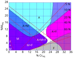 Mit Hilfe der Chrom- und Nickeläquivalente, welche die Abszisse (X-Achse) und Ordinate (Y-Achse) des Diagramms bilden, lassen sich für Stähle und Gusseisen Punkte im Diagramm darstellen. Das Nickeläquivalent wird errechnet aus den Massenanteilen der Legierungselemente, die bei Eisen dazu führen, dass Austenit im Gefüge enthalten ist. Das Chromäquivalent steht für die Wirksamkeit der ferritbildenden Elemente;[2] in der dritten Auflage 1983 (S. 213) wurden die Äquivalente wie folgt beziffert: