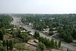 Der häufig vorkommende Ortsname ist vom persischen schahristān abgeleitet (schahr, „Stadt“) und bezeichnet in der mittelalterlichen iranischen Stadt den inneren Wohnbereich – vergleichbar der arabischen madīna – im Unterschied zur höher gelegenen Zitadelle (quhandiz) und den Außenbezirken (rabaḍ).[2] Der Schahristonsai trennt das Dorf in zwei etwa gleich große Hälften. Das Ortszentrum im Osten des Flusses wird von Markt gebildet, an dem täglich Gemüse, Obst und Haushaltswaren verkauft werden. Es gibt am zentralen Kreisverkehr einige Lebensmittelläden und ein oder zwei kleine Restaurants. Der größte Teil der besiedelten Fläche besteht aus Gehöften mit eingeschossigen Häusern, deren Wände aus Kies oder Bruchsteinen gemauert und mit Lehm verputzt sind. Unter den mit Wellblech gedeckten Giebeln lagert Winterfutter für die Tiere.