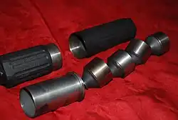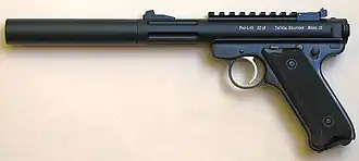 Ein Schalldämpfer, in Deutschland offiziell auch Mündungssignaturreduzierer genannt,[1] ist im Bereich der Waffentechnik eine an der Mündung der Schusswaffe befindliche Vorrichtung zur Reduktion der Schallemissionen und des Mündungsfeuers. Auch verringert sich der Rückstoß, was zusammen mit der Masse des Schalldämpfers den Hochschlag der Waffe vermindert. Zusätzlich verändert ein Schalldämpfer den Klang des Mündungsknalls. Sie existieren als auf die Mündung aufschraub- bzw. aufklemmbare Zusatzausrüstung und, deutlich seltener, als fest integrierter Bestandteil des Laufs (z. B. bei der HK MP5 SD).