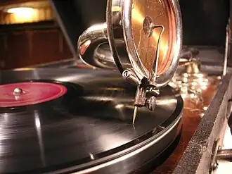 Tonarm mit Stahlnadel und Membran auf einer 25-cm-Schellackplatte, die sich zum Standardformat entwickelte