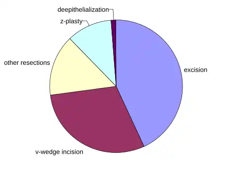 Die Exzision ist die üblichste und am häufigsten angewandte Methode.[32][33] Eine 2009 durchgeführte Befragung von 750 Ärzten, die allesamt Schamlippenverkleinerungen durchführten, zeigte die Verbreitung der verschiedenen Verfahren. Die befragten Ärzte gaben an, welche Verfahren sie verwendeten: 52,7 % Exzision, 36,1 % V-wedge Inzision, 13,9 % Z-Plastik und 1,2 % deepithelisierende Verkleinerung, 18,3 % andere Verfahren (es konnten mehrere Verfahren angegeben werden).[33]