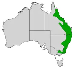 Die Art kommt im Osten Australiens vor. Die Verbreitung erstreckt sich von Cooktown auf der Kap-York-Halbinsel entlang den Küsten von Queensland und New South Wales bis zum Mitchell-River-Nationalpark in Victoria. Nomadenbewegungen von Populationen, um Gebiete zu erreichen, die ein besseres Nahrungsangebot erwarten lassen, treten zuweilen auf.[1] Bevorzugter Lebensraum sind Wälder mit hohen Bäumen. Unterarten werden nicht geführt.